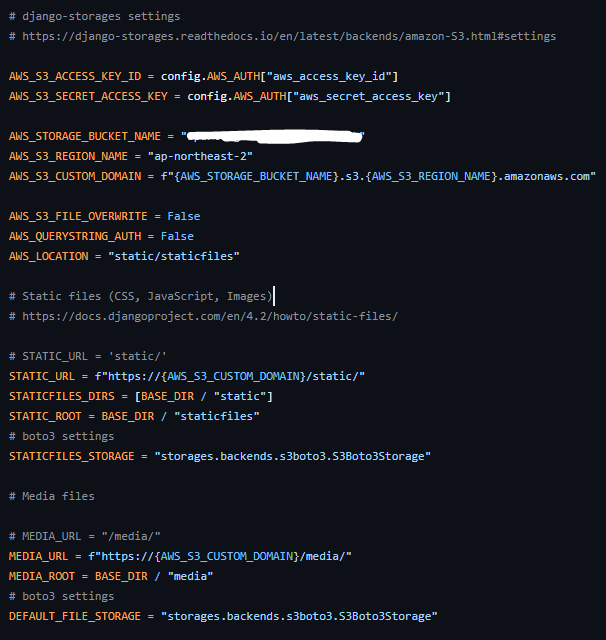 AWS_LOCATION 설정 덕분에 배포 서버에서 python3 manage.py collectstatic 명령어로 static 버킷의 static/staticfiles 폴더에서 파일들이 collect 되는 동작은 수행할 수 있었지만