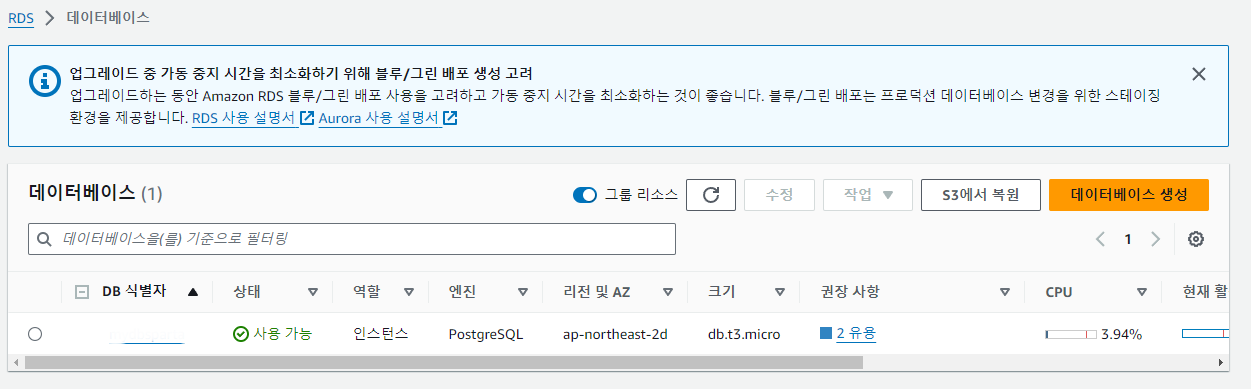 처음엔 DB 관리용 EC2 인스턴스를 생성하여 관리하는 것인 줄 알았는데 이미 RDS를 생성한 것이 하나의 별도 인스턴스를 생성한 것이였어서 DB를 별도의 인스턴스로 관리한 것이 됐다.